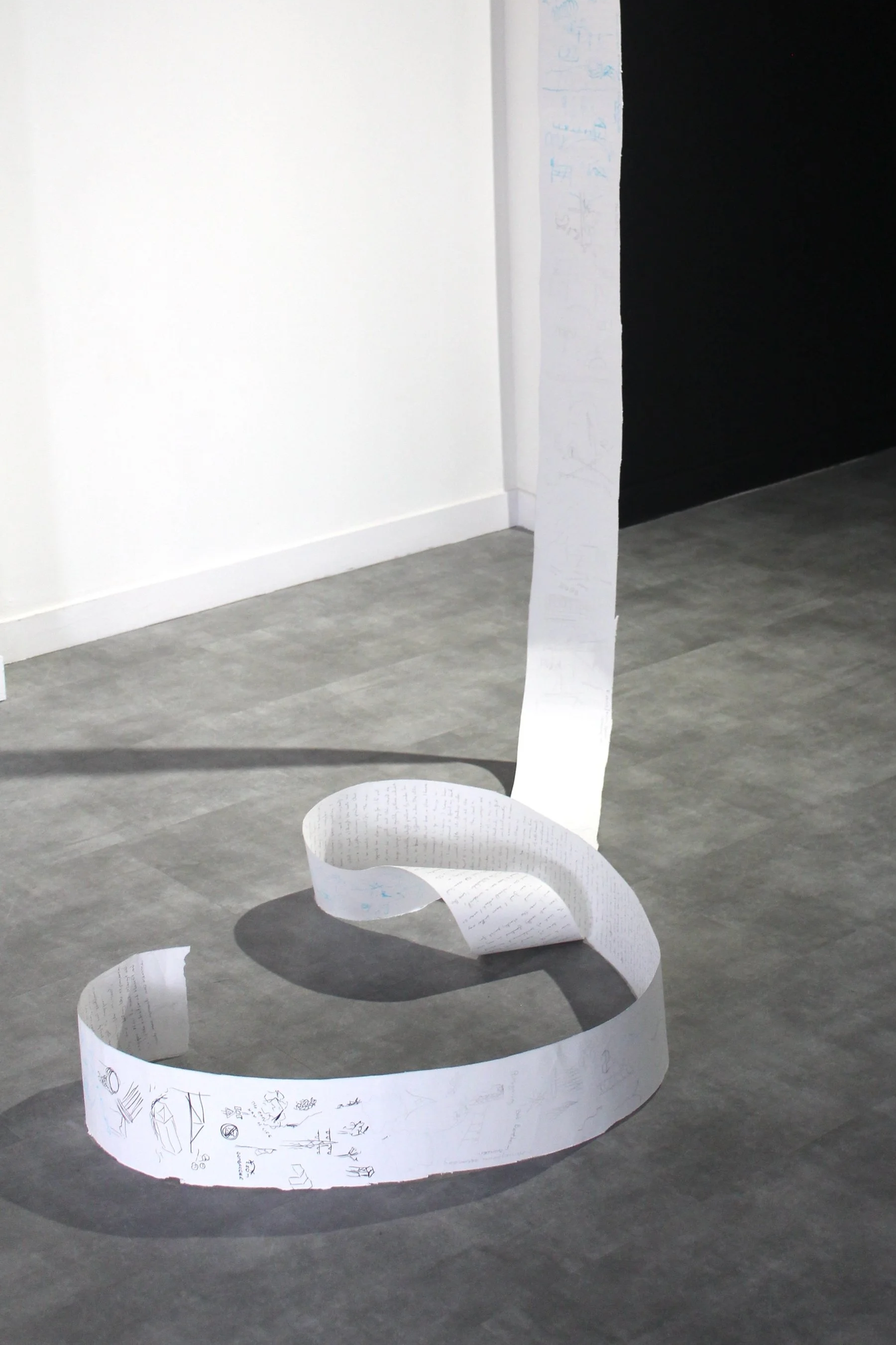 The drawing/text begins on the 5.42am train and continues throughout the day to Osnabrück through drawing and sound recordings that range from station chatter to border crossings. A stream of text, exactly fitting the length of the drawing, following the non-linear line of thoughts that occurred throughout the journey was added the next day. The drawings are made in real time and are generally unfinished, often jerky, whilst the text spans the personal, the observational and the opinionated and continues to the exact length of the drawings.