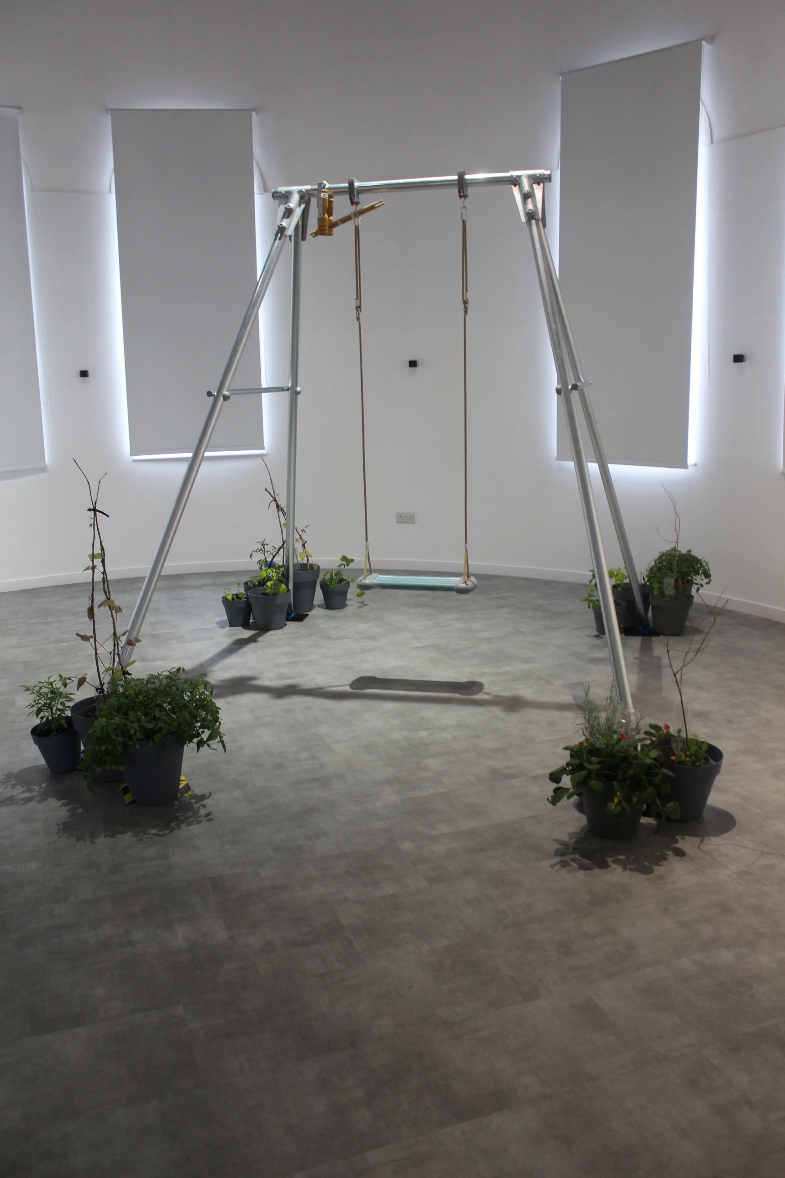 …….waits for no-one reflects on ideas of time through the sound ambiance of its communication in the endless ticking and chiming and cuckooing of clocks. And, meanwhile, the plants grow according to their nature, to their environment. This rhythm, which can be influenced to a certain extent, is the plants’ own. They may grow or die but either way, they are left in place as a reminder of the passing of time. Amidst these multitudinous reminders of passing time, the presence of the swing invites the viewer to create their own rhythm through the action of swinging.
